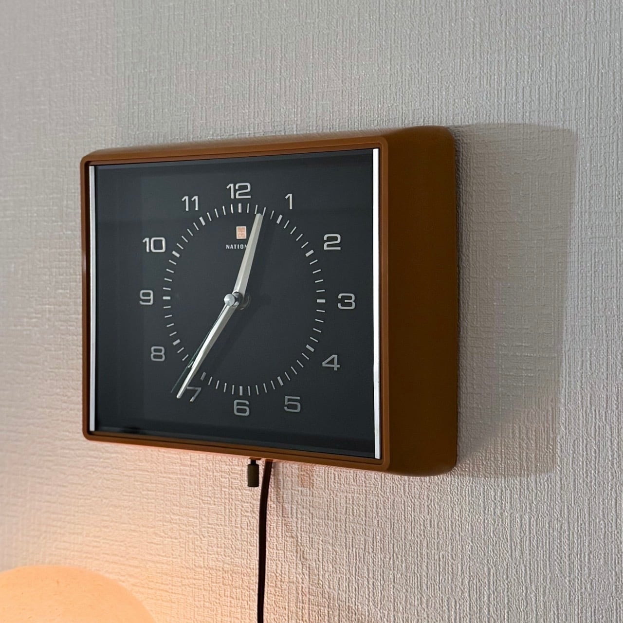 レトロでアンティークなナショナルの電気掛け時計です。ブラウンオレンジのシックなカラーです。